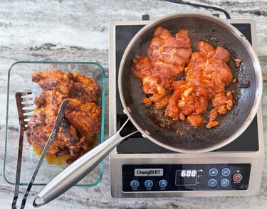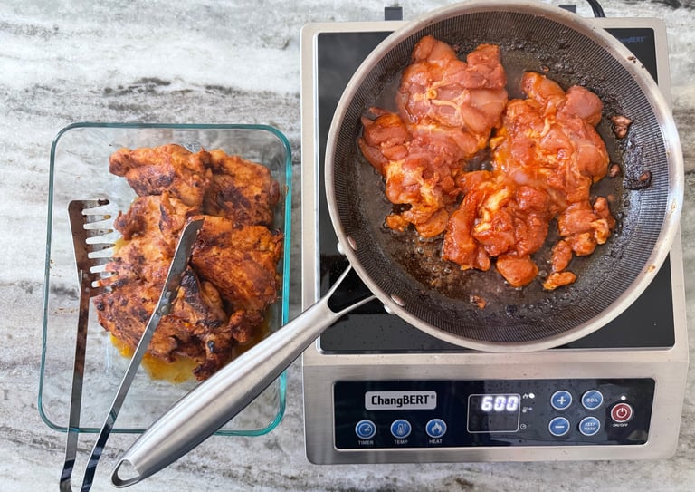 Heat 1 tbsp butter and 2 tbsp olive oil in a frying pan over medium heat (I use my ChangBERT Portable Induction Cooktop for fast, even heating). Add the chicken thighs and cook 3–4 minutes per side, until golden and the internal temperature reaches 165°F. Remove chicken and set aside, keeping the pan juices.